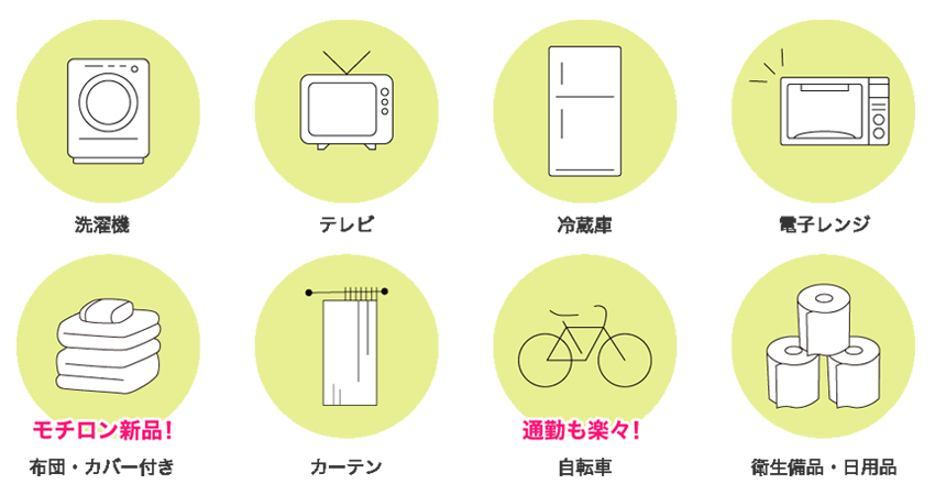 洗濯機、テレビ、冷蔵庫、電子レンジ、通勤用の自転車、などは勿論、日用品・衛生備品まで揃えてあります。